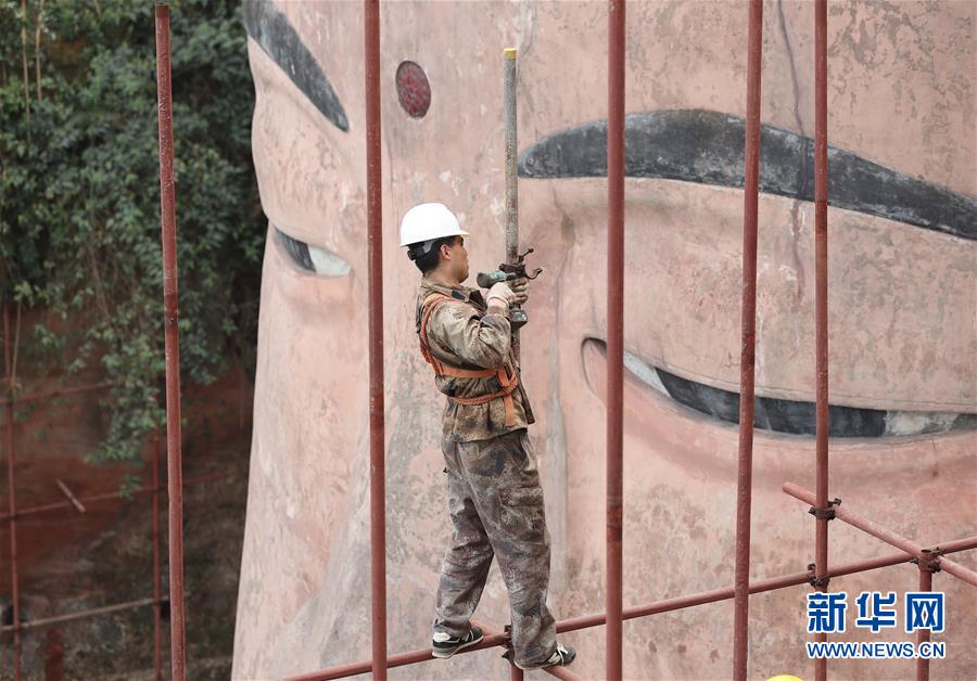 12月10日前后已逐步遮蔽大佛頭部,對(duì)頭面部進(jìn)行勘測(cè);12月底將開始拆除頭部腳手架,保證2019年元旦節(jié)之前,先露出佛頭,供游客觀賞。