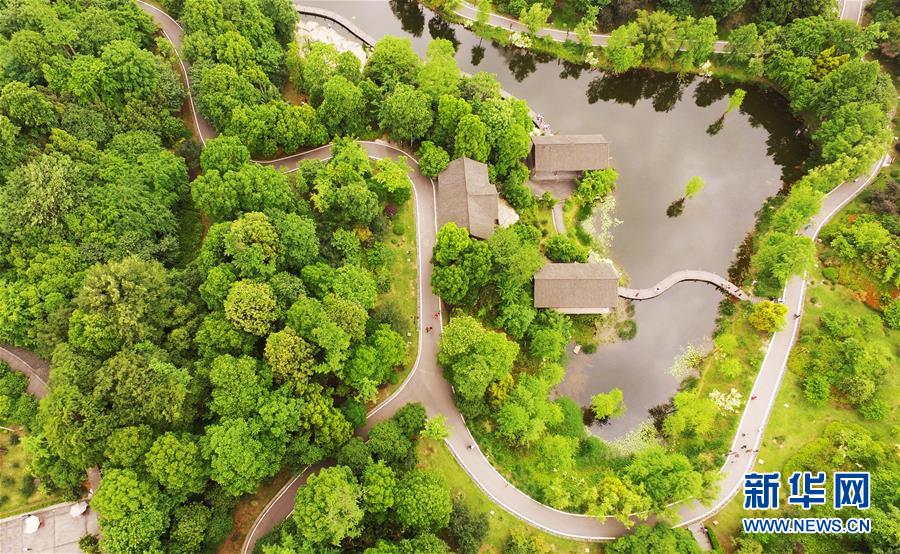 這是5月1日無(wú)人機(jī)拍攝的重慶璧山觀音塘濕地公園景象。