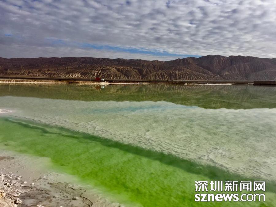 翡翠湖西距花土溝鎮(zhèn)28公里,就在315國道旁邊,它鉀肥鹵水的顏色純美剔透,如鑲嵌在戈壁的璞玉,形成了“水映丹霞、花土朝陽、昆侖橙霞”等魔幻奇觀。李仁奇  攝