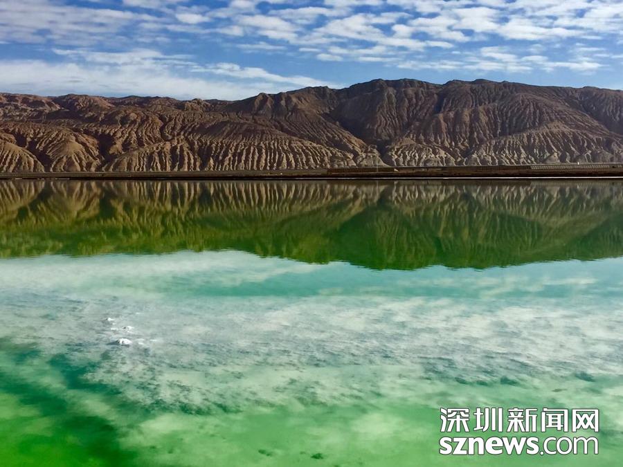 在青海柴達(dá)木盆地最西部的茫崖有一處硫酸鎂亞型人工鹽湖,以其翡翠綠色的鹽田與藍(lán)天白云和附近的丹霞地貌相映。李仁奇  攝