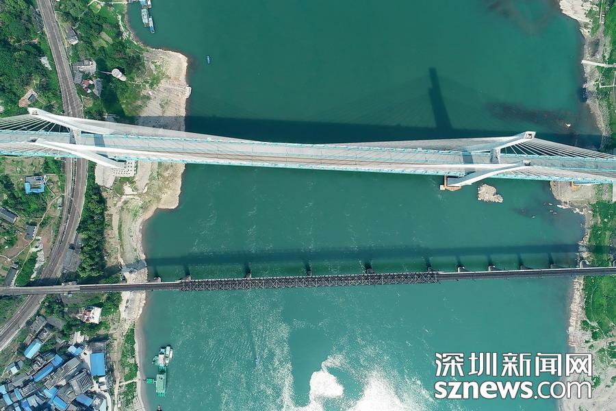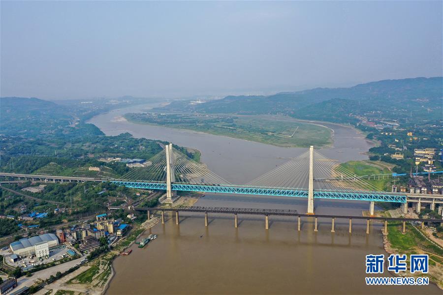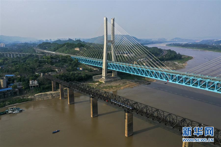 新白沙沱長江特大橋在老橋下游100米左右位置跨越長江,全長約5.3公里,為上下兩層六線鐵路橋,上層為四線鐵路客運專線,2018年1月25日隨著渝貴鐵路通車正式投入運營。該橋是渝貴鐵路全線規(guī)模最大、技術(shù)最為復雜的控制性工程,是世界上首座六線鐵路鋼桁梁斜拉橋,也是世界上每延米載荷量最大的橋梁,同時也是世界上首座雙層鐵路鋼桁梁斜拉橋。