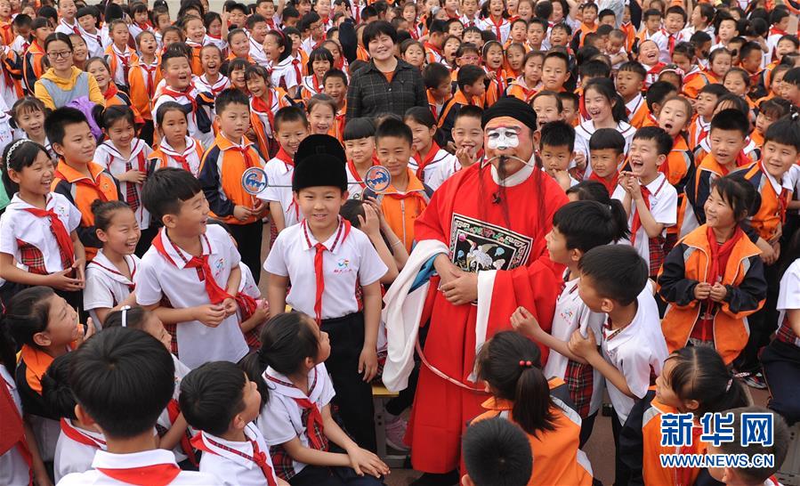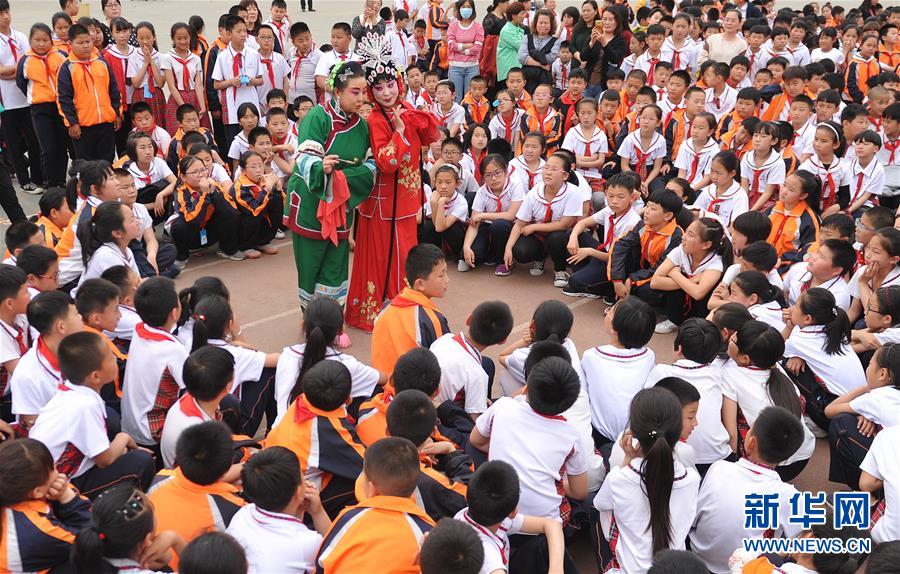 5月8日,滄州市小鳳霞評劇團演員在肅寧縣第三實驗小學與學生互動。
