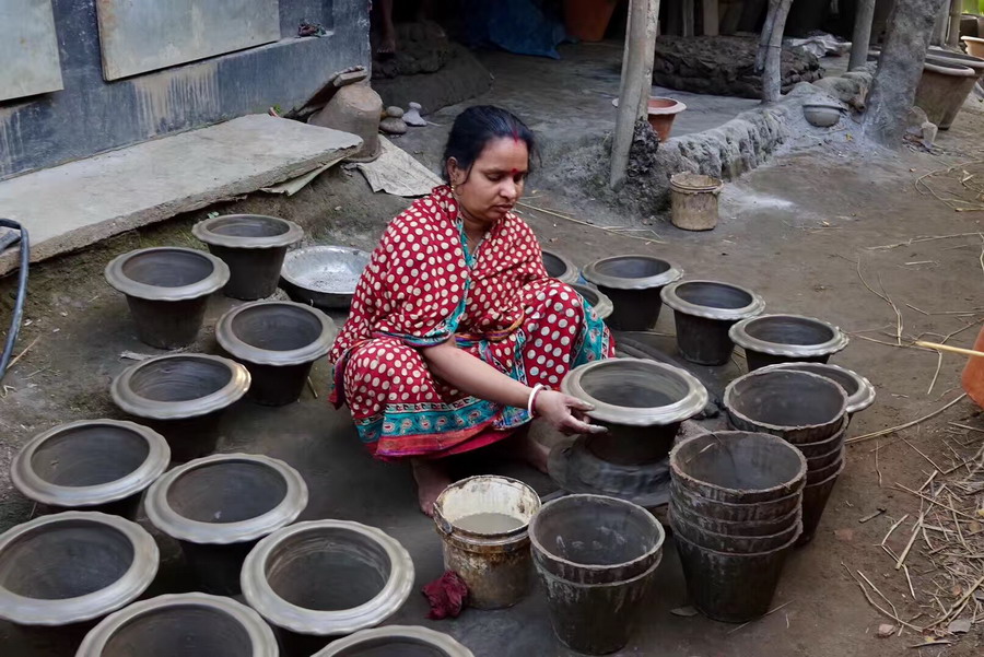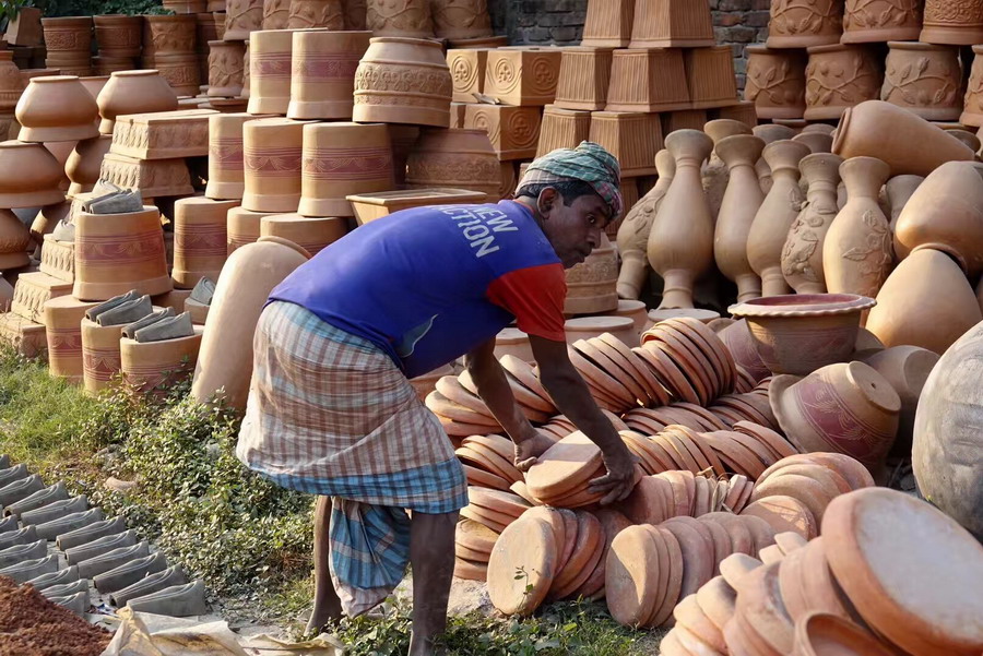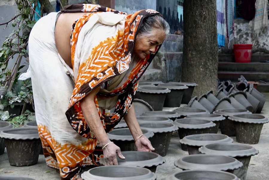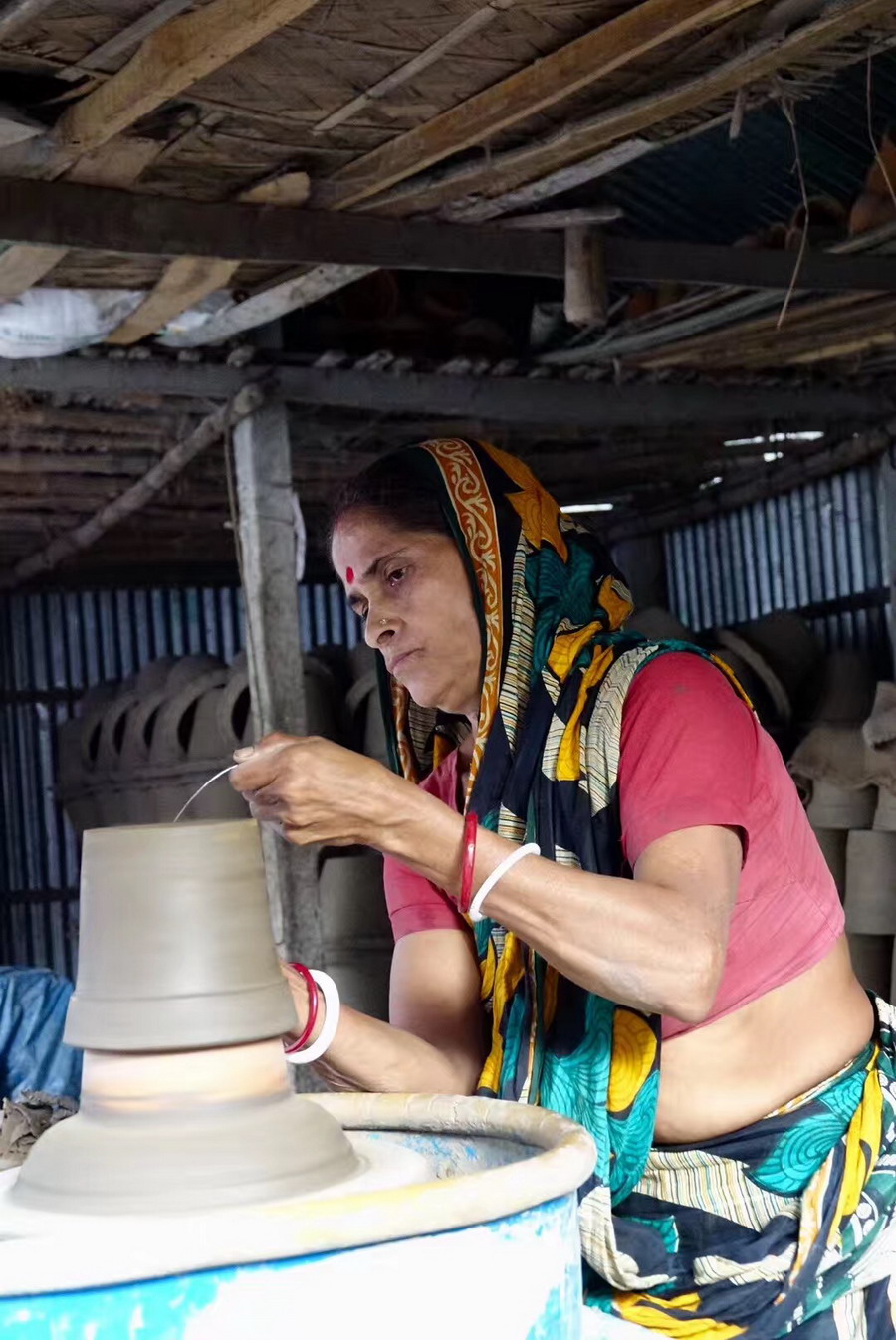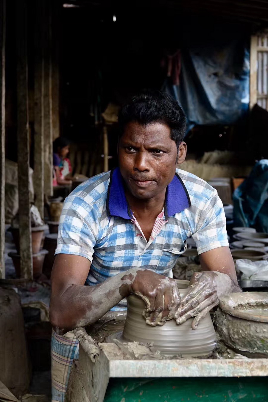 達(dá)卡遠(yuǎn)郊區(qū)一個(gè)印度教徒聚居的村莊,幾乎家家戶(hù)戶(hù)都開(kāi)辦制陶作坊,以傳統(tǒng)工藝制作陶盆、陶罐、陶盤(pán)和建筑裝飾陶器,遠(yuǎn)銷(xiāo)孟加拉國(guó)內(nèi)各地。李仁奇 攝
