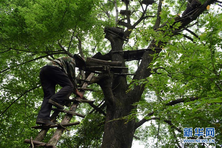 5月10日,在甘肅省隴南市徽縣大河店鎮(zhèn)硬灣村,蜂農(nóng)劉輝林準(zhǔn)備查看放在樹上的蜂箱情況。 甘肅省隴南市徽縣大河店鎮(zhèn)硬灣村位于秦巴山區(qū)深處,2017年,在當(dāng)?shù)卣姆龀窒拢堁吕铣裁垧B(yǎng)殖農(nóng)民專業(yè)合作社成立,蜂農(nóng)們將傳統(tǒng)養(yǎng)蜂技藝和現(xiàn)代加工方式相結(jié)合,并通過電商等渠道打開銷路,有效帶動(dòng)了當(dāng)?shù)刎毨Т迕衩撠氈赂?。目前整個(gè)合作社共有蜂箱2000余個(gè),每箱每年可帶來三四千元的收入。 新華社記者 馬寧 攝
