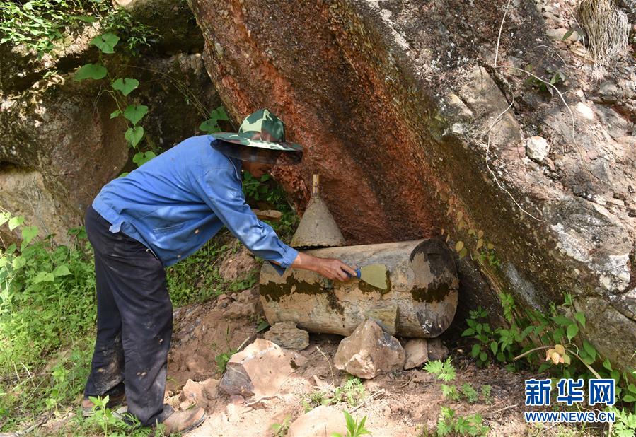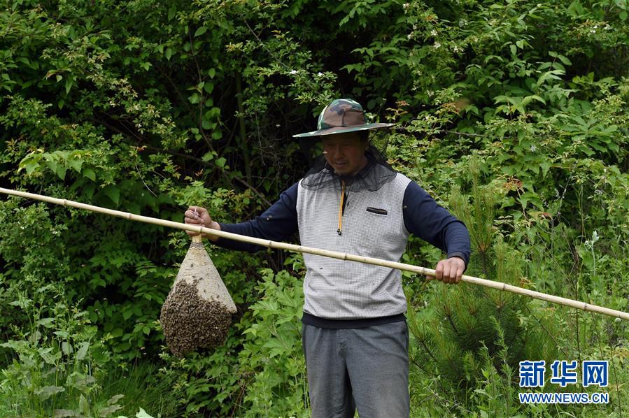 5月10日,在甘肅省隴南市徽縣大河店鎮(zhèn)硬灣村,蜂農(nóng)周仲頤在收蜂。 甘肅省隴南市徽縣大河店鎮(zhèn)硬灣村位于秦巴山區(qū)深處,2017年,在當(dāng)?shù)卣姆龀窒?,龍崖老巢蜜養(yǎng)殖農(nóng)民專業(yè)合作社成立,蜂農(nóng)們將傳統(tǒng)養(yǎng)蜂技藝和現(xiàn)代加工方式相結(jié)合,并通過電商等渠道打開銷路,有效帶動(dòng)了當(dāng)?shù)刎毨Т迕衩撠氈赂弧D壳罢麄€(gè)合作社共有蜂箱2000余個(gè),每箱每年可帶來三四千元的收入。 新華社記者 馬寧 攝