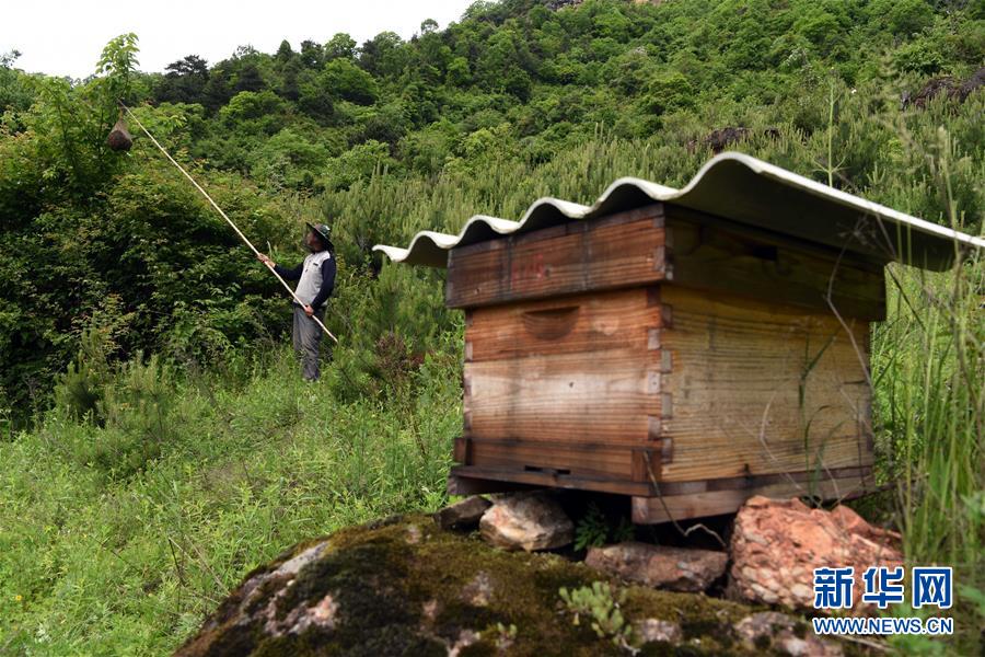 5月10日,在甘肅省隴南市徽縣大河店鎮(zhèn)硬灣村,蜂農(nóng)周仲頤在收蜂。 甘肅省隴南市徽縣大河店鎮(zhèn)硬灣村位于秦巴山區(qū)深處,2017年,在當(dāng)?shù)卣姆龀窒拢堁吕铣裁垧B(yǎng)殖農(nóng)民專業(yè)合作社成立,蜂農(nóng)們將傳統(tǒng)養(yǎng)蜂技藝和現(xiàn)代加工方式相結(jié)合,并通過(guò)電商等渠道打開(kāi)銷路,有效帶動(dòng)了當(dāng)?shù)刎毨Т迕衩撠氈赂?。目前整個(gè)合作社共有蜂箱2000余個(gè),每箱每年可帶來(lái)三四千元的收入。 新華社記者 馬寧 攝