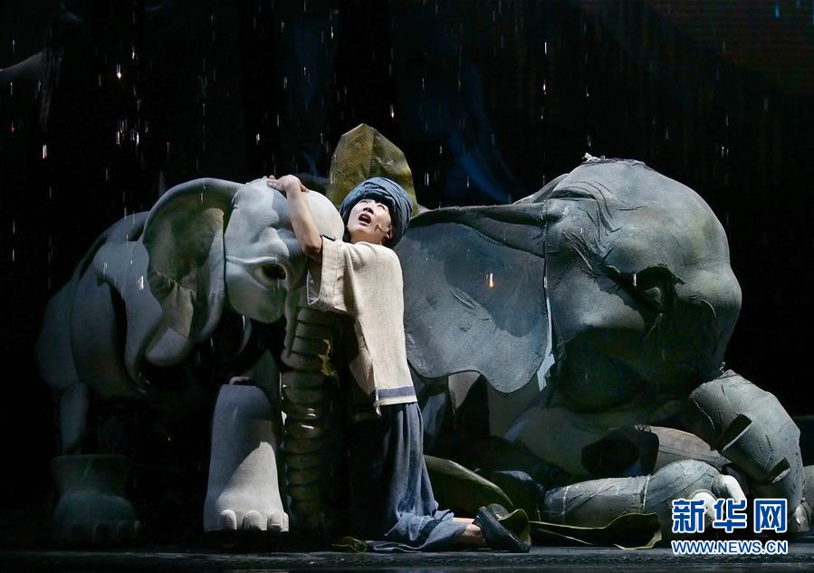 5月15日在上海美琪大戲院拍攝的新版大型人偶舞臺劇《最后一頭戰(zhàn)象》劇照。 當日,作為第12屆中國藝術節(jié)的參演劇目,大型人偶舞臺劇《最后一頭戰(zhàn)象》在經(jīng)過4次硬件技術升級和故事修改后亮相上海美琪大戲院。 新華社記者 任瓏 攝