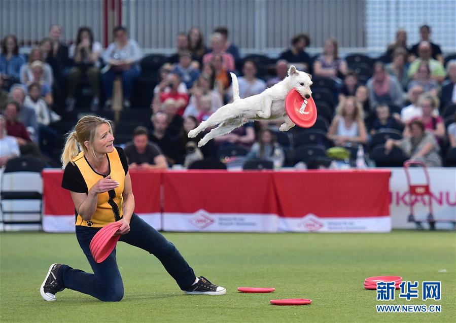 5月19日,在德國(guó)多特蒙德舉行的寵物展上,訓(xùn)犬師沃爾夫帶著愛(ài)犬進(jìn)行“狗接飛盤(pán)”表演。 為期三天的德國(guó)多特蒙德“狗和貓”寵物展19日落幕。寵物展期間,人們帶著自己的“萌寵”來(lái)到會(huì)場(chǎng),參與寵物跳水、舞蹈、選美等趣味比賽,并與其他寵物愛(ài)好者及展商交流互動(dòng)。 新華社記者逯陽(yáng)攝