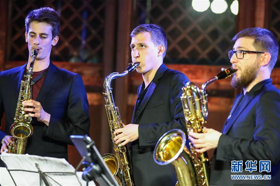 5月26日,凱比亞特樂隊成員在音樂會上表演。 當(dāng)日,作為第十九屆“相約北京”藝術(shù)節(jié)系列演出之一,西班牙凱比亞特樂隊薩克斯四重奏音樂會在北京Temple東景緣上演。 新華社記者 張玉薇 攝