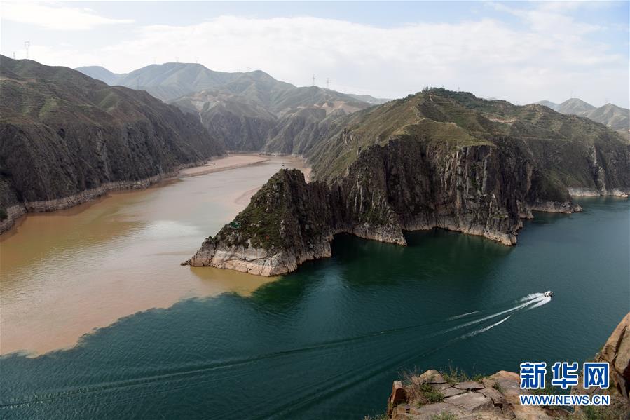 6月2日,在甘肅省臨夏回族自治州永靖縣劉家峽水庫,一艘快艇在洮河和黃河的匯合水域行駛。