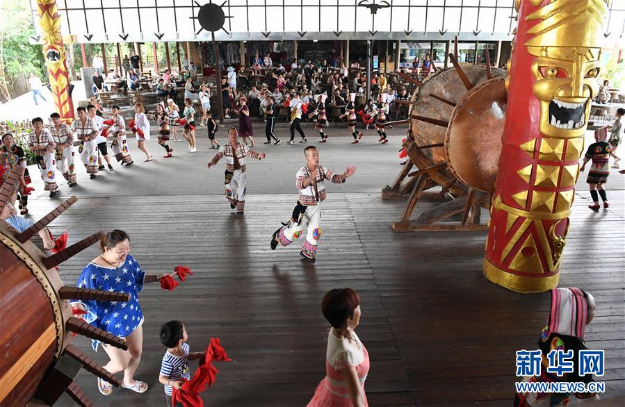 游客與基諾族大鼓舞演員一起跳舞(6月1日攝)。 在云南省西雙版納傣族自治州景洪市基諾山基諾族鄉(xiāng)的基諾族村寨,每天的基諾大鼓舞表演吸引了眾多游客前來觀賞體驗,帶動了基諾族群眾就業(yè)和增收?;Z族大鼓舞蘊涵豐富的歷史文化內(nèi)涵,已被列入國家級非物質(zhì)文化遺產(chǎn)保護(hù)名錄。 新華社記者 楊宗友 攝