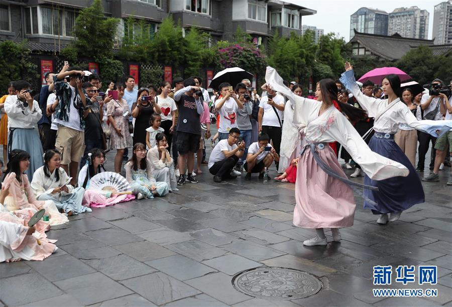 6月9日,在成都寬窄巷子,漢服愛(ài)好者表演舞蹈。