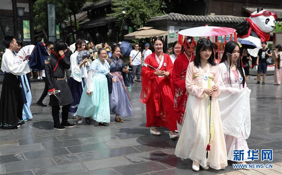 6月9日,漢服愛(ài)好者在成都寬窄巷子巡游,宣傳“聞香識(shí)寬窄”主題活動(dòng)。新華社記者 江宏景 攝