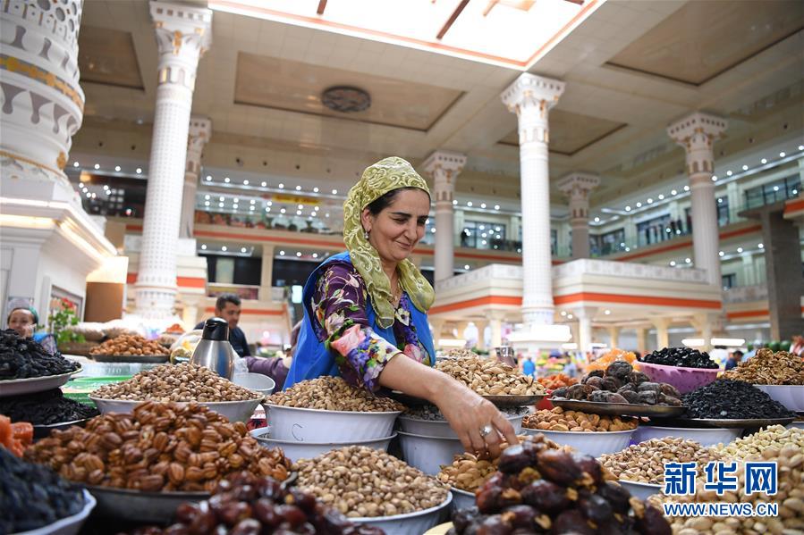 6月10日,在塔吉克斯坦首都杜尚別,一名商販?zhǔn)圪u干果。塔吉克斯坦共和國,簡稱塔吉克斯坦,是位于中亞東南部的內(nèi)陸國家。塔吉克斯坦是多民族國家,全國共有86個(gè)民族,人口約910萬。新華社記者沙達(dá)提攝