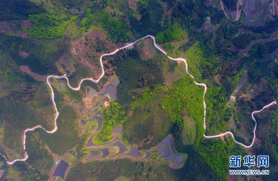 這是融水苗族自治縣桿洞鄉(xiāng)黨鳩村烏英苗寨的公路(4月18日無人機(jī)拍攝)。新華社記者 黃孝邦 攝
