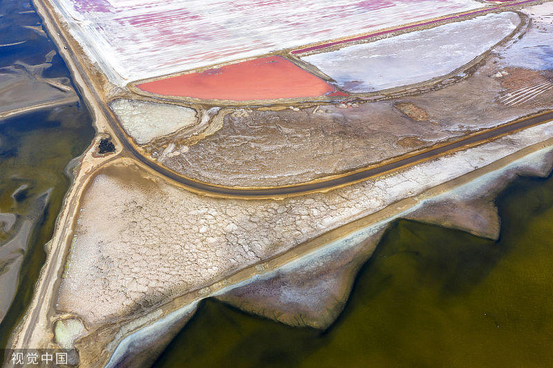 這片俯拍的鹽田總面積達3500公頃(35平方千米),因為當?shù)睾T搴望}的濃度不同造成了鹽田的不同色彩。