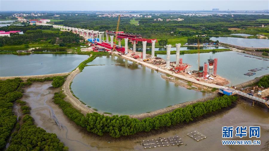 這是7月6日無人機拍攝的湛江調順跨海大橋東岸移動模架施工現場。 新華社記者 劉大偉 攝