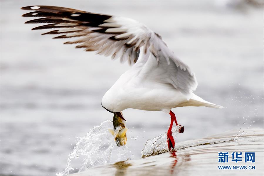 7月6日,在青海省剛察縣沙柳河,一只棕頭鷗捕捉到一只湟魚后飛離水面。  新華社記者 費(fèi)茂華攝