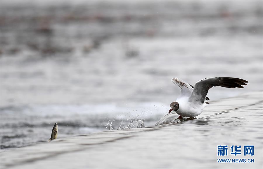 7月6日,在青海省剛察縣沙柳河里,一只棕頭鷗捕捉到一只躍起的湟魚。 新華社記者 劉金海攝