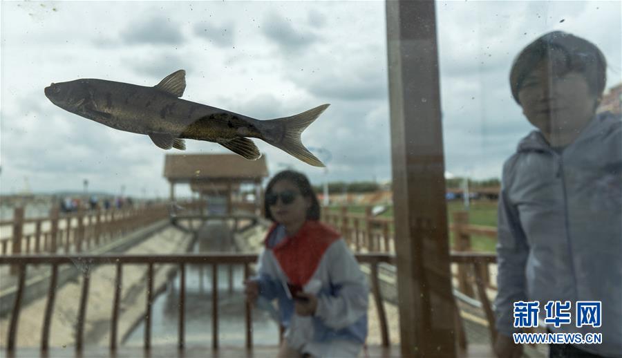 7月6日,在青海省剛察縣湟魚廣場,兩名游客在觀賞魚缸中的湟魚。  新華社記者費(fèi)茂華攝