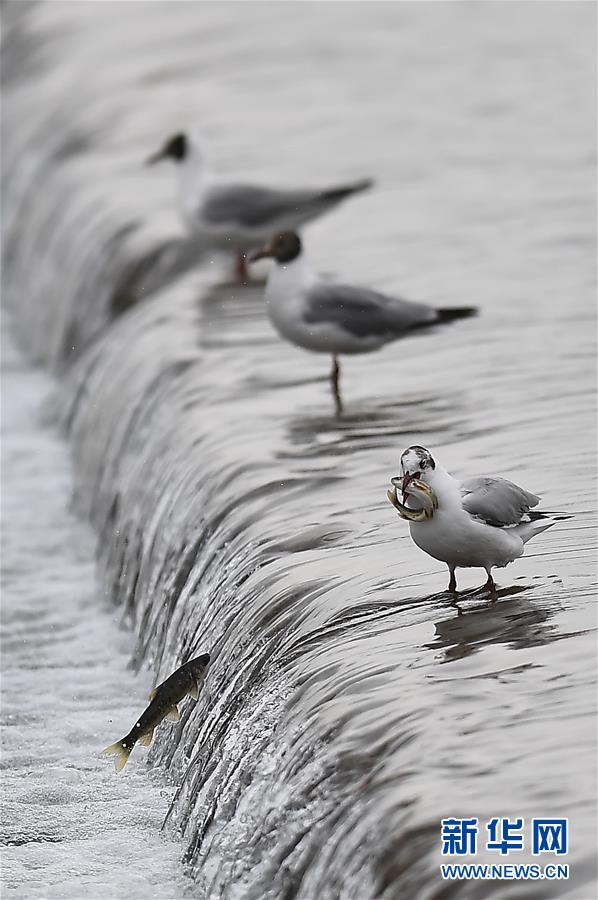 7月6日,在青海省剛察縣沙柳河里,幾只棕頭鷗等待捕捉躍起的湟魚。  新華社記者 費(fèi)茂華攝