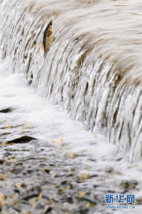 7月6日,在青海省剛察縣沙柳河里,一只湟魚躍起向上洄游。 新華社記者 劉金海攝