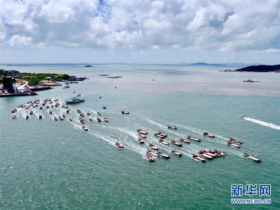 8月3日,在首屆福清開漁節(jié)上,漁船駛向大海(無(wú)人機(jī)拍攝)。新華社記者姜克紅攝