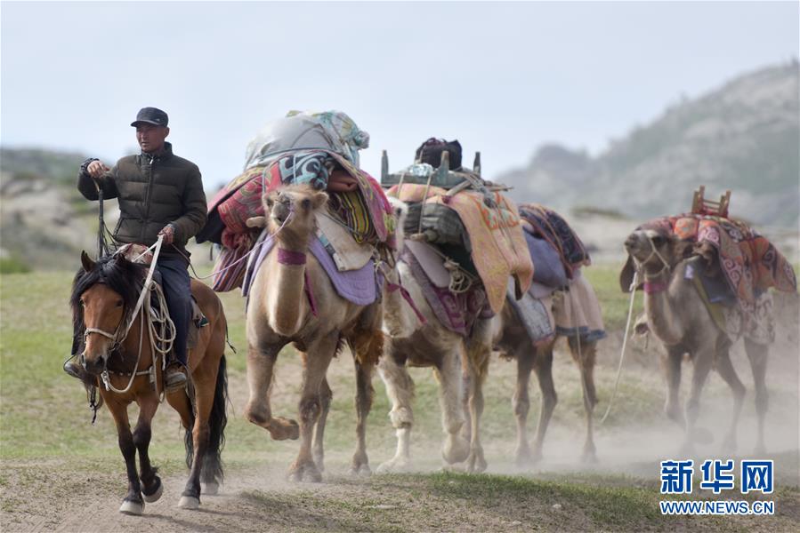 新疆阿勒泰地區(qū)福海縣牧民帶著駝隊行進在轉(zhuǎn)場途中(6月6日攝)。新華社記者丁磊攝