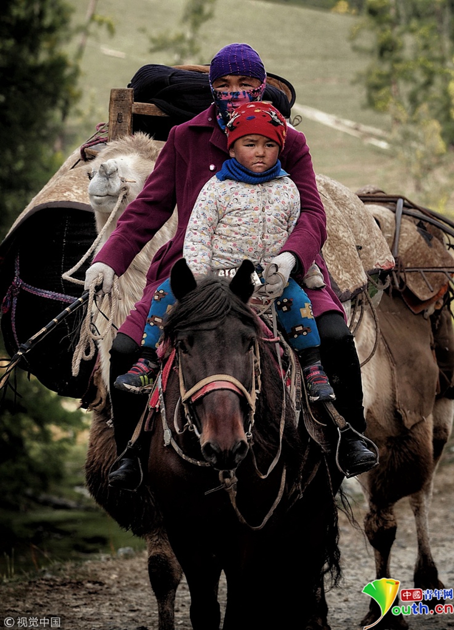 2018年9月11日,新疆阿勒泰美麗的托勒海特夏牧場天氣逐漸變冷,哈薩克族牧民整理好行裹,抱著孩子,趕著牛羊,浩浩蕩蕩向秋牧場遷徙。