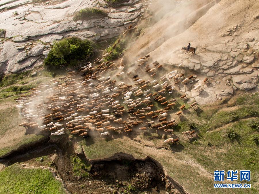 6月6日,轉(zhuǎn)場的牲畜行走在牧道上。新華社記者 丁磊 攝