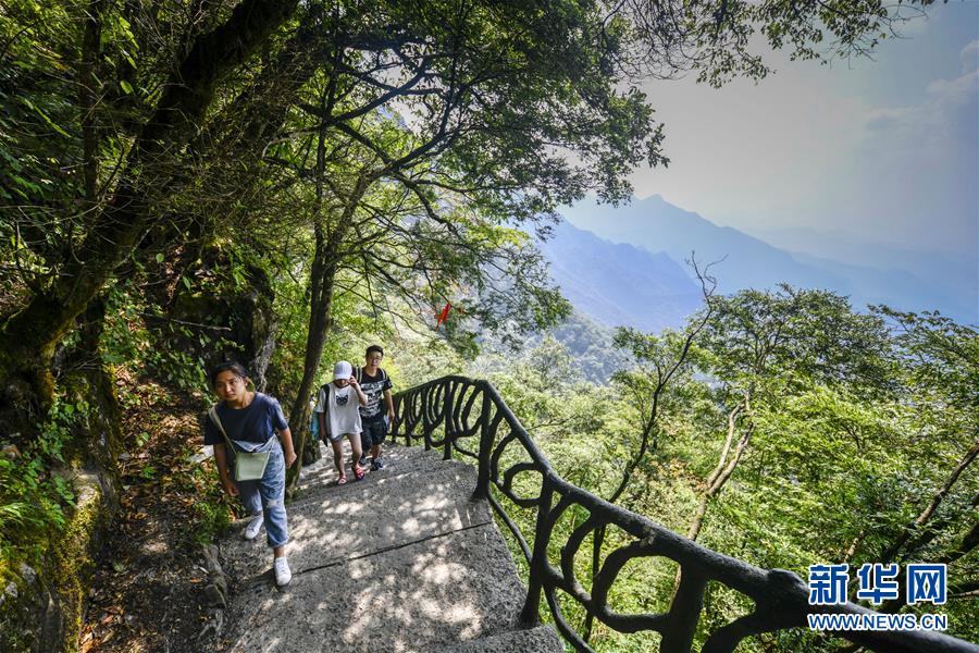 游客在重慶金佛山風(fēng)景區(qū)內(nèi)的絕壁棧道上游覽體驗(yàn)(8月20日攝)。  新華社記者 劉潺 攝