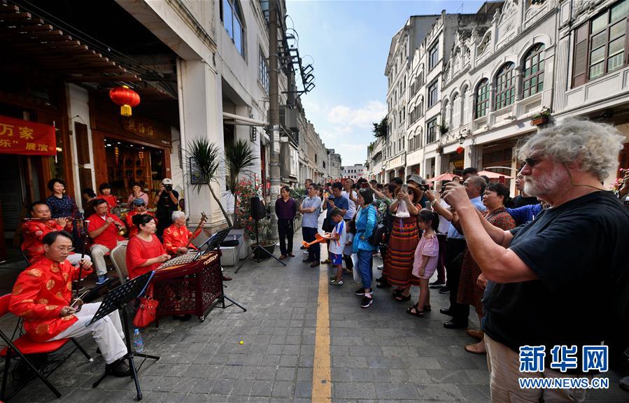 游客在??谥猩铰夫T樓老街觀看海南八音樂器表演(2019年2月6日攝)。新華社記者郭程攝