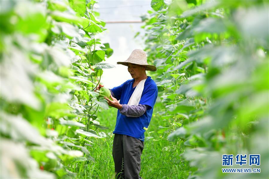 在廣西融安縣大良鎮(zhèn)古蘭村古蘭屯大棚基地,62歲的黃顯亮查看甜瓜生長情況(8月18日攝)。黃顯亮是大棚基地的技術(shù)員,每個(gè)月有3000多元的工資,已于2018年實(shí)現(xiàn)脫貧。 新華社記者 黃孝邦 攝