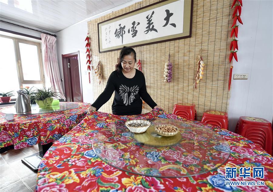 在舒蘭市二合屯,何翠華在自家農(nóng)家樂(lè)內(nèi)整理桌布(1月25日攝)。二合雪鄉(xiāng)的發(fā)展讓二合屯村民何翠華將“農(nóng)閑”變?yōu)椤稗r(nóng)忙”,一個(gè)雪季能夠收入近4萬(wàn)元。 新華社記者許暢攝