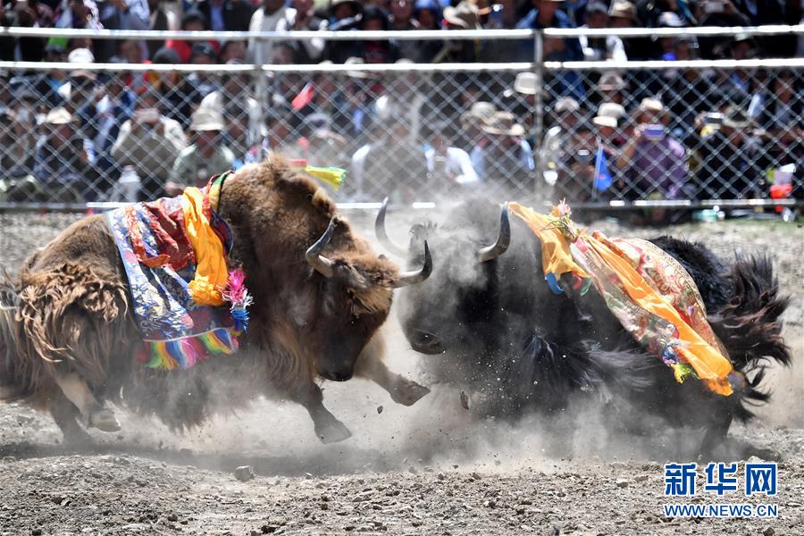 者下鄉(xiāng)斗牛節(jié)歷史悠久,是西藏自治區(qū)非物質文化遺產。牧民為參加比賽的種牦牛披綢掛緞,將牛群趕到位于日喀則市白朗縣者下鄉(xiāng)的斗牛場上。參賽的種牦牛為了爭奪牛群的控制權,在成群的母牛面前,更加好斗。角斗有的瞬間分出勝負,有的持續(xù)幾十分鐘,最終勝出的被稱為“牦牛至尊”。