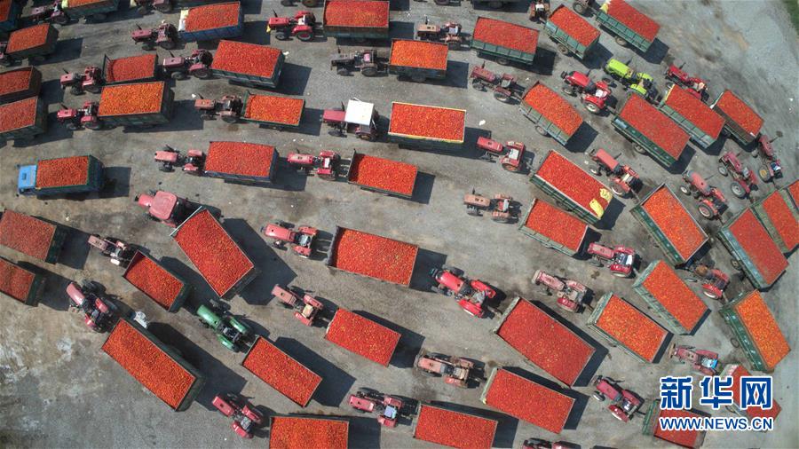 9月4日無人機拍攝的河套灌區(qū)三道橋鎮(zhèn)農民向本地蔬菜加工廠排隊出售番茄。 新華社記者 劉詩平 攝