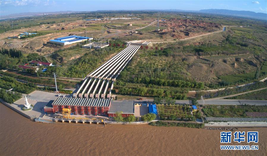 在寧夏固海揚水工程泉眼山泵站,巨大的揚水管道將黃河水從低處向高處抬升(8月31日無人機拍攝)。新華社記者劉詩平攝