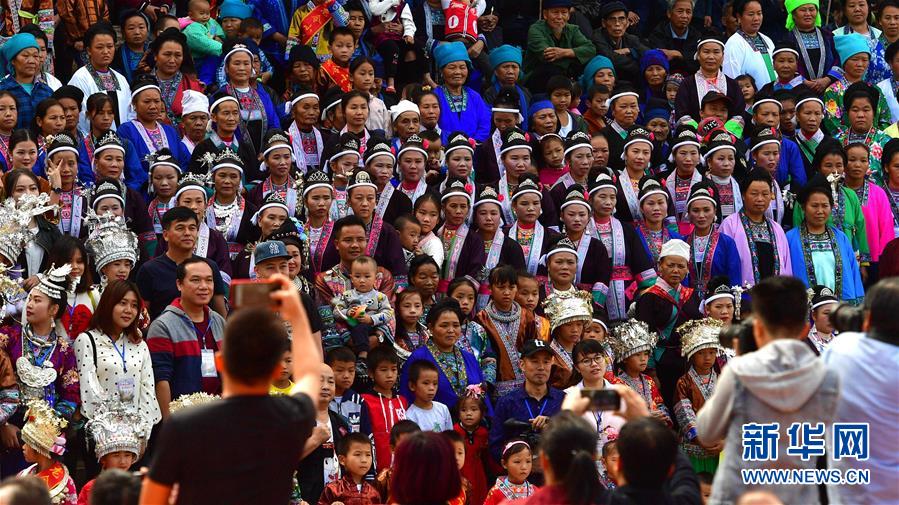 10月28日,在廣西融水苗族自治縣拱洞鄉(xiāng)龍令村,游客和各族群眾合影。新華社記者 黃孝邦 攝