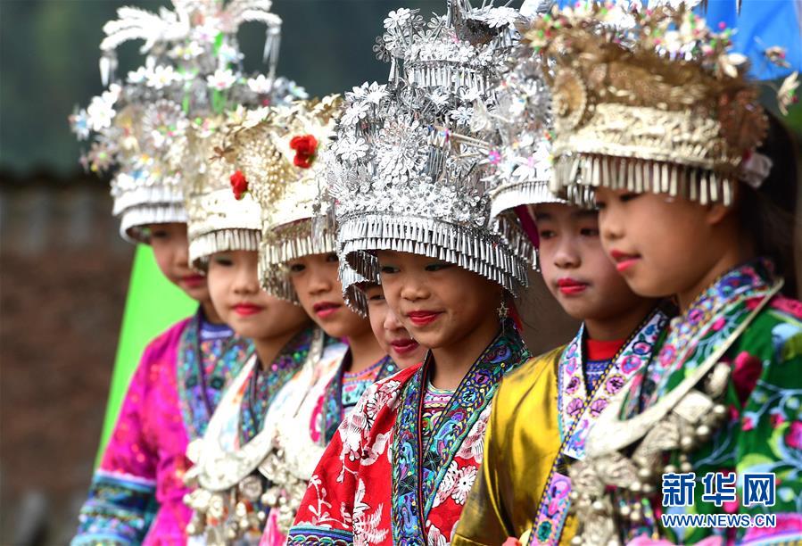 10月28日,在廣西融水苗族自治縣拱洞鄉(xiāng)龍令村,小朋友們參加慶祝豐收活動。新華社記者 黃孝邦 攝