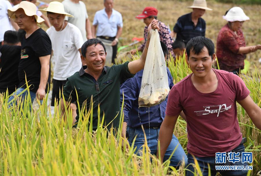9月15日,人們在稻田里參加摸魚比賽。 新華社記者 楊宗友 攝