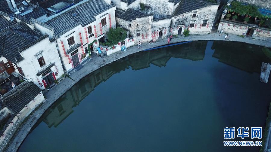 這是8月4日無人機拍攝的安徽黟縣宏村風景區(qū)月沼晨景。新華社記者張端攝