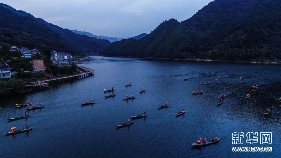 9月25日,在宋村鄉(xiāng)云源港的水面上,漁民劃著漁船,船頭點(diǎn)亮漁燈,構(gòu)成一幅“漁舟唱晚、萬家燈火”的美麗圖景,與沿湖民宿群落交相輝映(無人機(jī)拍攝)。 新華社記者 徐昱 攝