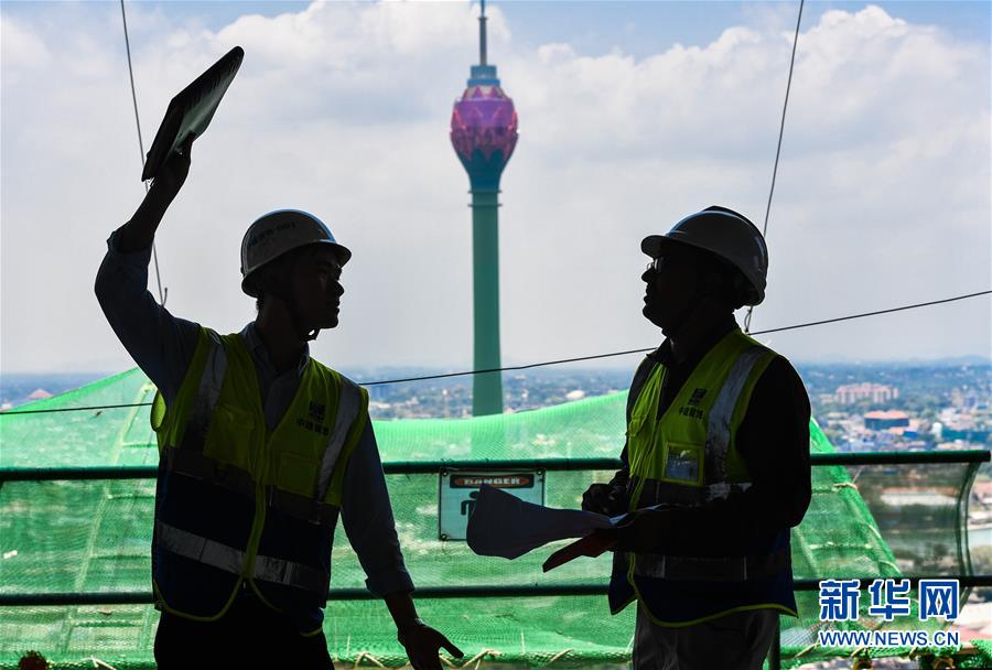 2019年4月9日,在斯里蘭卡科倫坡,中方項目經(jīng)理楊子江(左)與項目副經(jīng)理Thuwan在工地討論工作進度,他們背后是科倫坡地標建筑蓮花塔。Thuwan是中國中建裝飾集團深圳裝飾公司斯里蘭卡濱江度假村項目的副經(jīng)理。在中方管理人員手把手的指導下,Thuwan從最初的一名普通商務員變成了一位優(yōu)秀的屬地化管理人員,成為了中斯雙方人員溝通的橋梁。新華社記者劉大偉攝