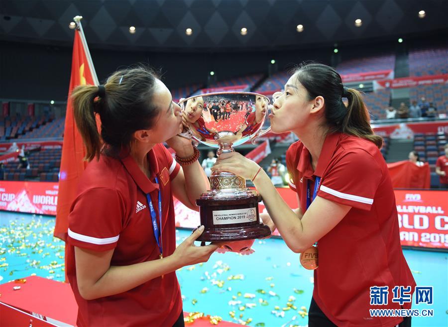 9月29日,中國隊球員曾春蕾(左)和劉曉彤在頒獎儀式后親吻獎杯。新華社記者賀燦鈴攝