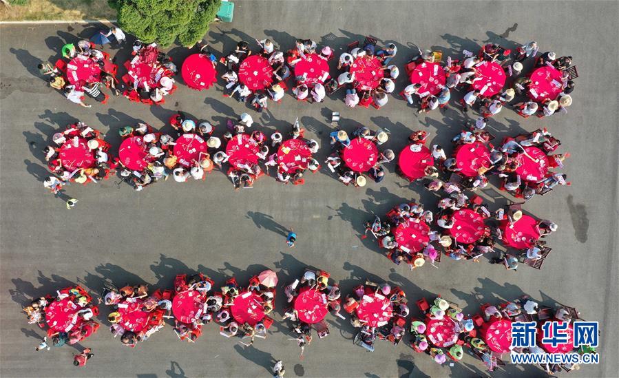 10月1日,在江西省南昌市南昌縣銀三角敷林村,當(dāng)?shù)卮迕衽e行“同吃國(guó)慶面 共迎國(guó)慶節(jié)”活動(dòng)(無人機(jī)拍攝)。當(dāng)日是國(guó)慶節(jié),全國(guó)各地的人們用各種方式歡度節(jié)日。新華社記者 彭昭之 攝
