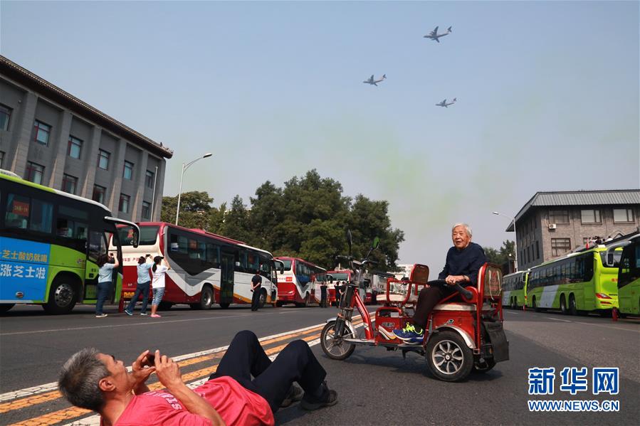 10月1日,在北京琉璃廠,當(dāng)受閱飛機(jī)飛過時(shí),北京市民趙先生(左)為92歲的老母親拍照留影。當(dāng)日是國(guó)慶節(jié),全國(guó)各地的人們用各種方式歡度節(jié)日。新華社記者 薛東梅 攝