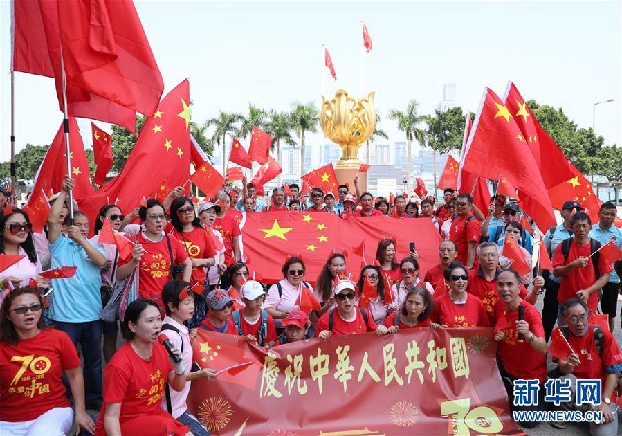 10月1日,香港市民在金紫荊廣場(chǎng)高唱愛國(guó)歌曲。當(dāng)日是國(guó)慶節(jié),全國(guó)各地的人們用各種方式歡度節(jié)日。新華社記者 吳曉初 攝