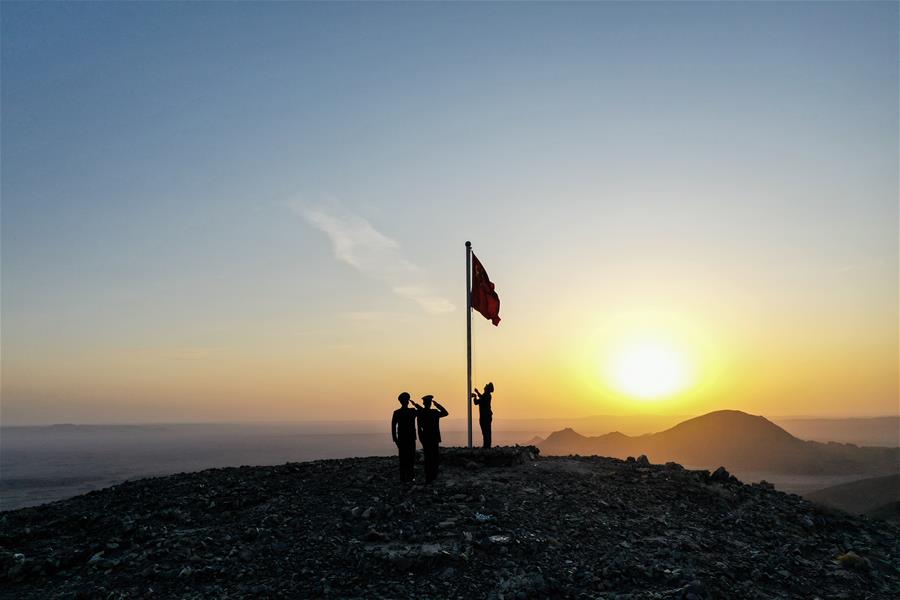9月27日,內(nèi)蒙古自治區(qū)額濟(jì)納旗算井子邊境派出所民警在大紅山上舉行升國(guó)旗儀式。新華社記者劉磊攝