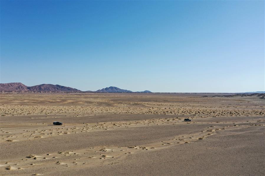 9月25日,內(nèi)蒙古自治區(qū)額濟(jì)納旗算井子邊境派出所的民警開車對(duì)轄區(qū)進(jìn)行巡護(hù)(無(wú)人機(jī)拍攝)。新華社記者劉磊攝