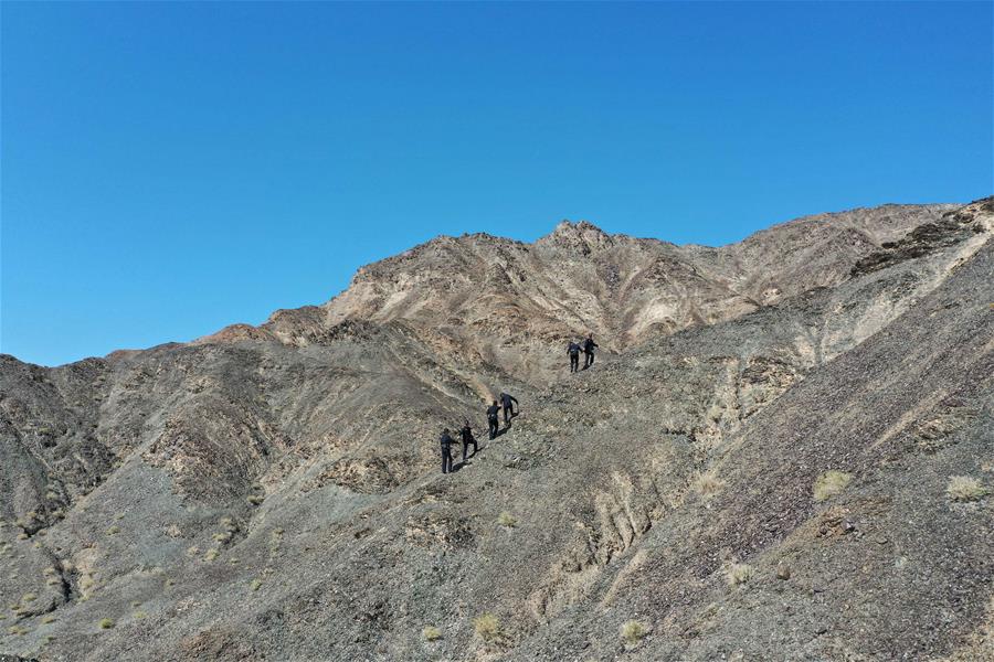 9月25日,內(nèi)蒙古自治區(qū)額濟納旗算井子邊境派出所民警登山進行巡護。新華社記者劉磊攝